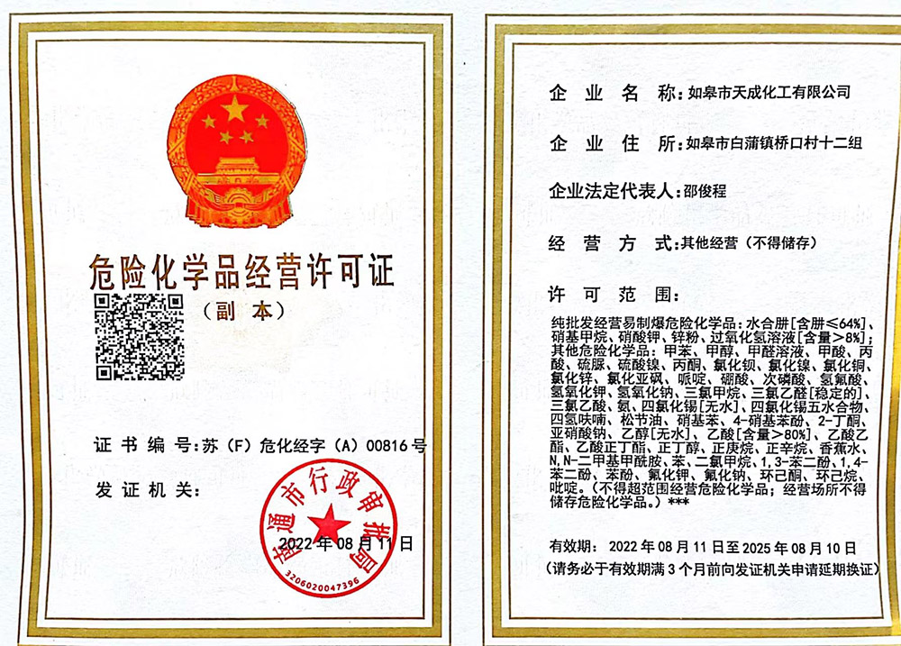 ?      如皋市天成化工有限公司創(chuàng)建于1996年。公司地處于美麗富饒的長江三角洲,座落在古鎮(zhèn)林梓,通揚(yáng)運(yùn)河河畔。南瀕長江、西臨204國道,距南通港、飛機(jī)場30公里,立體交通發(fā)達(dá)。公司經(jīng)營管理規(guī)范,技術(shù)力量雄厚,擁有一批高、中級專業(yè)技術(shù)人才。   公司主要產(chǎn)品為:無水四氯化錫、結(jié)晶四氯化錫、氯化亞錫、三氯乙酸、甲酸銨、苯甲酸銨、對硝基苯酚、對硝基苯甲酸、苯乙醛、癸醛、防腐劑等。產(chǎn)品品質(zhì)優(yōu)異、價(jià)格合理,主要銷往北京、上海、廣州、福州、安徽、江西等省市,并出口歐美、東南亞等國家和地區(qū),一直深受廣大新、老用戶的好評。   公司連年被評為“重合同守信用企...[更多內(nèi)容]